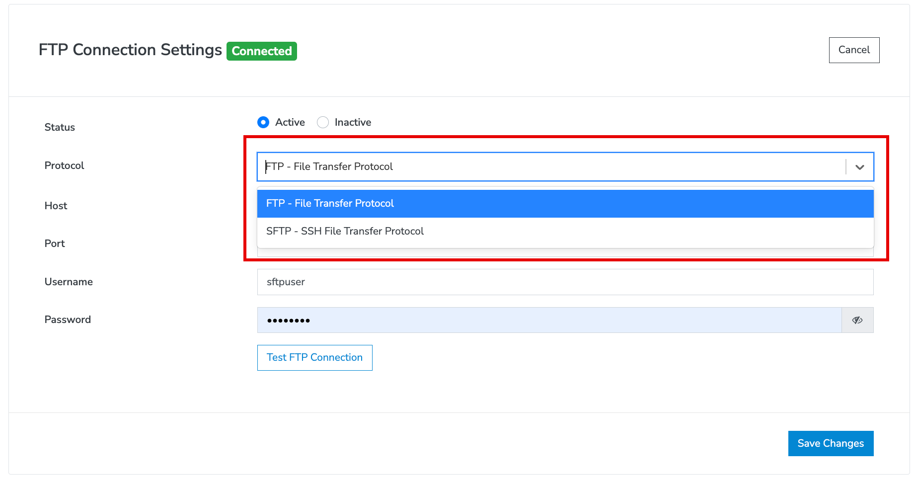 5. Once the FTP is connected, click the **'Save Changes'** button.
